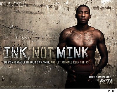 Phoenix Suns center Amar’e Stoudemire is getting down with PETA’s (People for Ethical Treatment of Animals) new campaign: “Ink, Not Mink.” This latest anti-fur campaign encourages people to “be comfortable in their own skin,” and “let animals keep theirs.”
