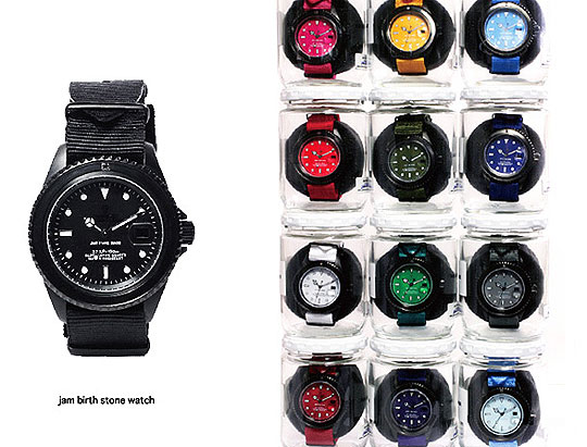 “…Japanese brand JAM HOME MADE & ready made. Inspired by vintage military and diving watches, the brand presents the Birth Stone Watch. It comes with a metal case and matching canvas strap in a series of colorways…”