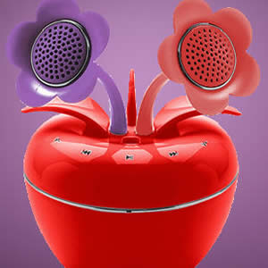 The iPom is shaped like an apple with two additional speakers fashioned into flowers, all in bright, happy colors. The flowers detach and can be placed around the room providing 360-degree sound.