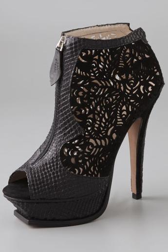 These peep-toe suede booties feature laser cutouts and snake-embossed leather trim. Zip front closure. Notch detail at top line. Available from Jill Stuart .