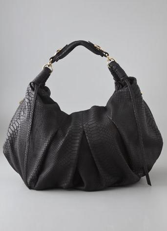 This snake-embossed leather handbag features pleats at the front and back. Zippered slits and wrapped tassels at sides. Gold hardware. Available from CC Skye.