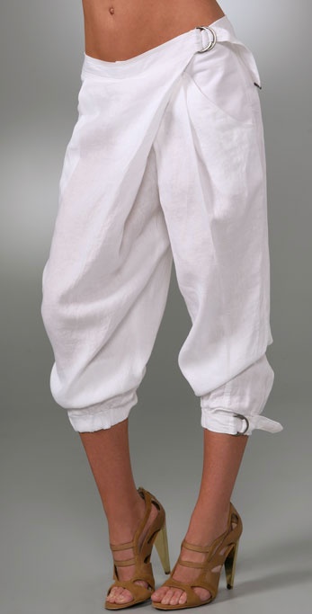 These cropped linen pants feature belted strap details at the folded waist and at the gathered elastic hem. Slant front pockets and welt back pockets. Hidden single-button closure and zip fly. Semi-sheer.