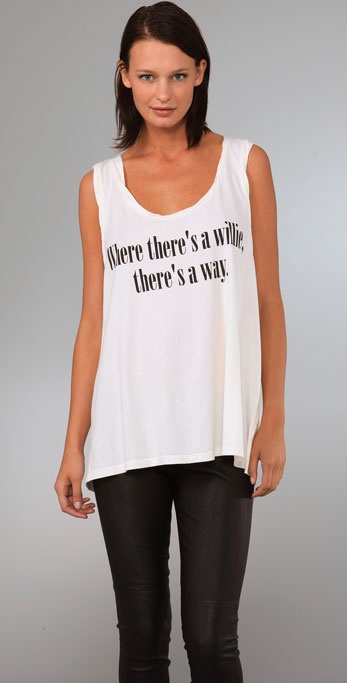 This oversized, scoop-neck jersey tank features ‘Where there’s a willie, there’s a way” lettering at the front. Twisted banding at neckline and at deep arm openings. 3″ straps.