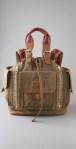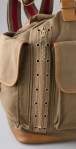 This oversized canvas handbag features a logo tag and a turn-lock closure at the flap pocket. Zip closures, canvas banding, and grommets at large patch pocket. Button-tab closure at flap side pockets. Leather trim and brass hardware. Striped double handles and adjustable, striped shoulder straps. Drawstring main compartment closure. Print-lined interior features zip pocket and 2 patch pockets. Can also be worn as a backpack.
