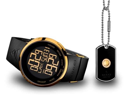 “The i-Gucci, features two discreet digital hands revealing local time, double-layout digital display features a special tag celebrating the Grammy’s partnership. The yellow PVD stainless-steel case is complemented by a wide, black or white rubber strap that sports both the Grammy and Gucci logos.”