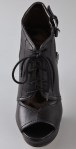 These open-toe, lace-up leather platform booties feature buckle details and a cutout vamp. Suede insets and snake-embossed heel cap. 1.25″ (30 mm) covered platform and 5″ (125 mm) snake-embossed stiletto heel. 3.5″ (9 cm) shaft. Leather sole.