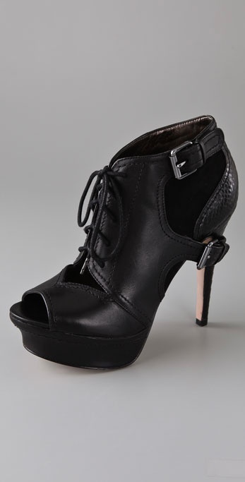 These open-toe, lace-up leather platform booties feature buckle details and a cutout vamp. Suede insets and snake-embossed heel cap. 1.25″ (30 mm) covered platform and 5″ (125 mm) snake-embossed stiletto heel. 3.5″ (9 cm) shaft. Leather sole.