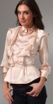 This silk button-down shirt features ruffle trim at the shoulders and front. Ruching at structured peplum. Fold-over collar and 6-button closure. Knife pleat at single-button cuffs. 3/4 sleeves.