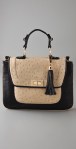 This two-tone, ostrich-embossed leather handbag features a logo turn-lock closure at the front flap and a patch pocket under the flap. Logo plate at back. Gold hardware. Detachable tassel and buckle details at handle. Detachable shoulder strap. Divided, print-lined interior features zip pocket and 3 patch pockets.