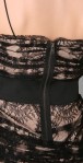 This dress features ruching at the contrast lace overlay. Unfinished edge at sweetheart neckline and knot detail at bust. Contrast elastic waistband and exposed back zip. Boning at bodice. Spaghetti straps. Lined. Straps can be tucked in for a strapless look.