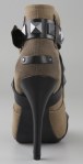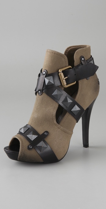 These open-toe twill booties feature studded, contrast leather straps. Buckled ankle strap and side cutouts. Discoloration at toe and heel cap. Hidden platform and leather-covered heel. Leather lining and rubber sole.