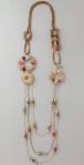 This antiqued, tiered mixed-chain necklace features assorted agate beads and wrapped wires at the disc details. Multicolored, woven leather and cotton cords at bugle beads. Knot details and frayed, print chiffon braid at box chains.