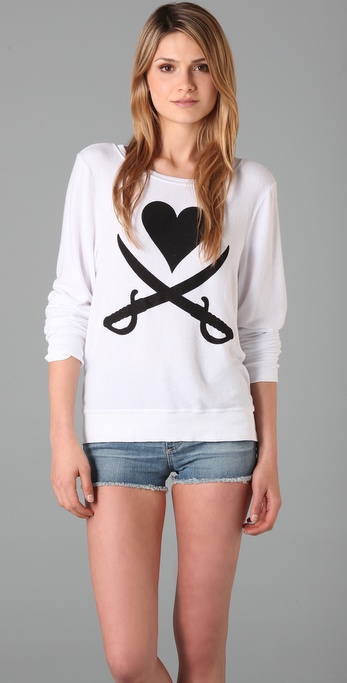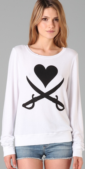 This scoop-neck jersey pullover features a heart and swords graphic and light pilling. Ribbed banding at edges. Long sleeves.