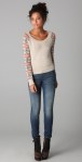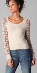 This scoop-neck sweater features a solid body and Fair Isle long sleeves. Ribbed edges.