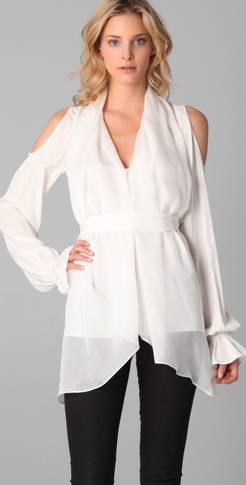 This stretch-silk blouse features draped silk-chiffon overlays at the front. Scoop neck and hidden 4-button closure. Removable self-belt. Cutouts at shoulders. Gathered elastic cuffs at long poet sleeves. Semi-sheer.