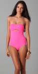 This one-piece features a cutout at the front and boning at the bandeau top. Diagonal seaming. Hook-and-eye closure and cutout at back. Removable halter strap. Lined.