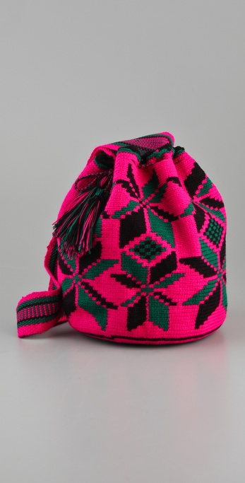 This hand-woven handbag features a one-of-a-kind geometric pattern. Long shoulder strap and tasseled drawstring main-compartment closure. Numbered wood logo ring.