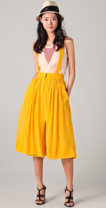 Who on earth can’t get jiggy with a bright skirt fully equipped with suspenders?! Fashion freak out much? Check out this silk-chiffon skirt from Sonia Rykiel.