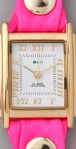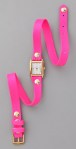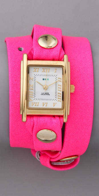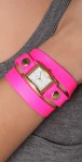 This neon wrap watch features a textured Italian leather band, studs, and a square case. Japanese movement. Adjustable length.