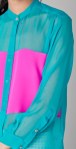 This silk-chiffon blouse features a contrast crepe panel at the front. Mandarin collar and hidden 7-button closure. Pleating at back and at 2-button cuffs. Long sleeves. Semi-sheer.