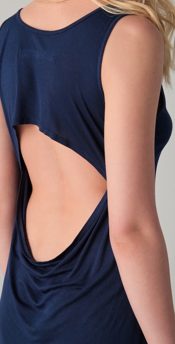 This long, scoop-neck jersey tank dress features draping at the cutout back. Raw hem. 1.5″ straps. Semi-sheer.