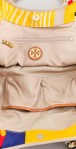 This print canvas Tory Burch tote features a leather logo medallion and trim. Patch pockets at gussets. Double handles and gold hardware. Magnetic-snap main compartment closure. Lined interior features zip pocket and 2 patch pockets.