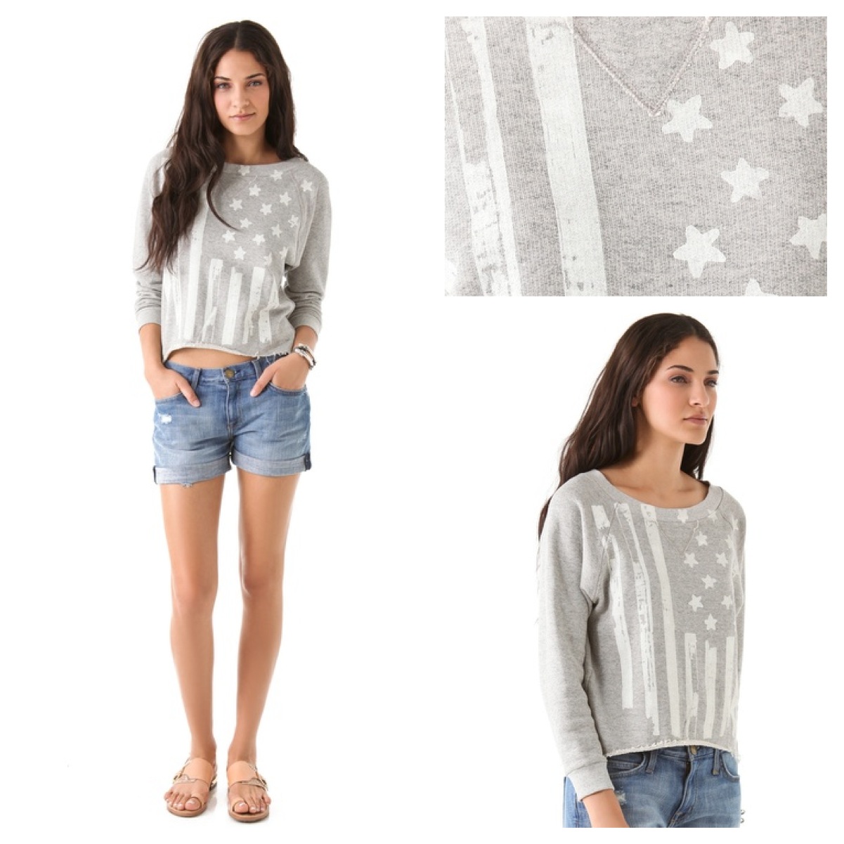 A rolled, raw hem and painted flag graphic add a chic, undone look to this cropped French terry Haute Hippie top. Ribbed banding trims the wide neckline and cuffs. Long sleeves.