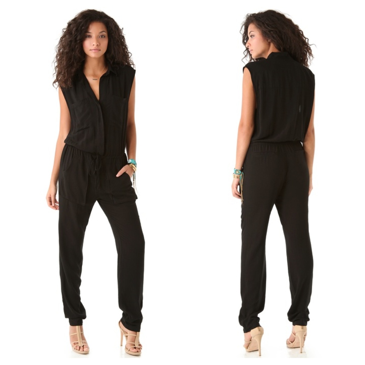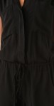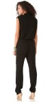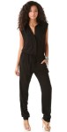 A loose-fitting, straight-leg jumpsuit with patch bust pockets and a crisp fold-over collar. Hidden buttons fasten the placket and a drawstring cinches the waist. Pockets slant at the hips and trim the back. Sleeveless.