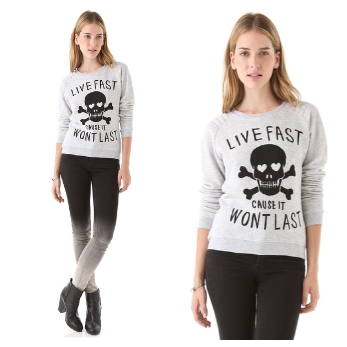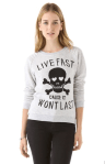 With ‘LIVE FAST CAUSE IT WONT LAST’ lettering and a grinning skull and crossbones graphic, a French terry sweatshirt makes a tongue-in-cheek statement. Topstitched shoulders accent the long raglan sleeves. Fabric: French terry.