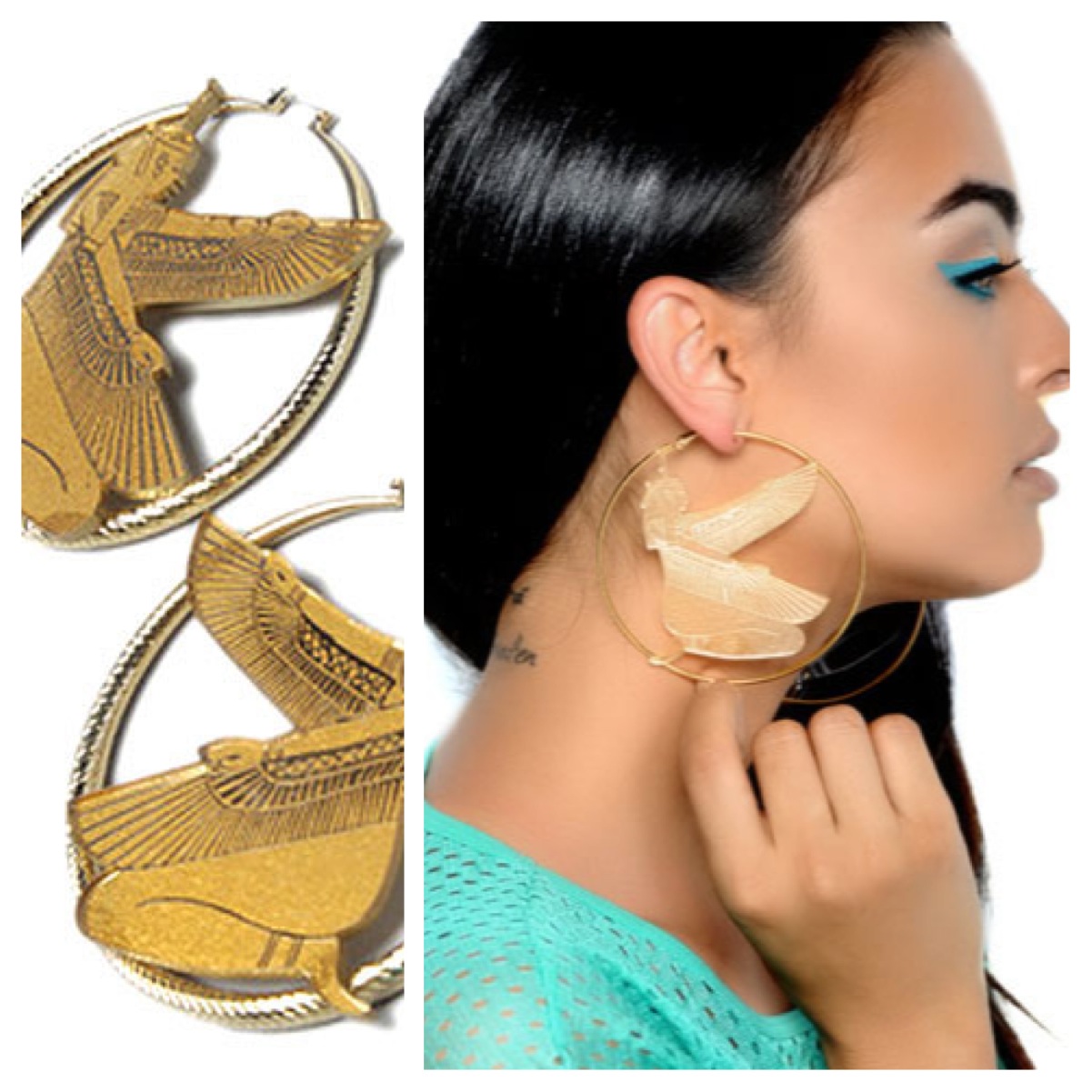 Cues Rihanna’s boob tattoo.. but not really. Check out these earrings from designer Melody Ehsani, featuring the Egyptian goddess Isis, laser etched on mirrored acrylic with gold plated hoop earring.