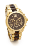 A polished gold-tone finish and Roman numeral markers lend elegance to this Michael Kors chronograph watch, and tortoiseshell links complete the sophisticated look. Three subdials and a date wheel complete the dial. Hinged-snap clasp.