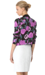 Graphic roses bloom across a striking blazer styled with discreet welt hip pockets. A solid shawl collar trims the placket, while buttons fasten to the pointed, asymmetrical hem. Elbow darts and light shoulder padding lend structure to the long sleeves. Lined.