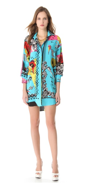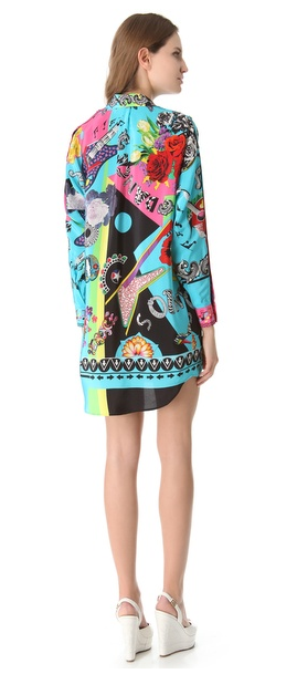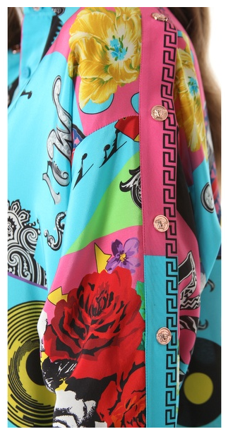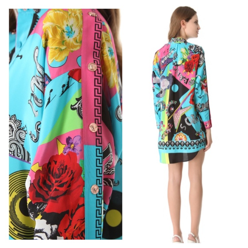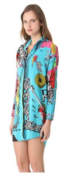 The luster of silk crepe adds an elegant tone to a Versace shirtdress printed in a wild combination of bright florals and musical elements. The fold-over collar gives way to a hidden-button placket, and the shirttail hem lends graceful movement. Polished, embossed snaps allow for a sexy, customized look through the long sleeves. Unlined.