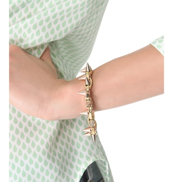 Two rows of gleaming spikes add an edgy touch to a mixed-metal, chain-link bracelet. Lobster-claw clasp.ย Available here
