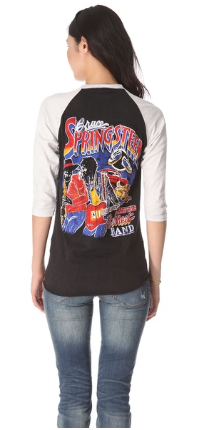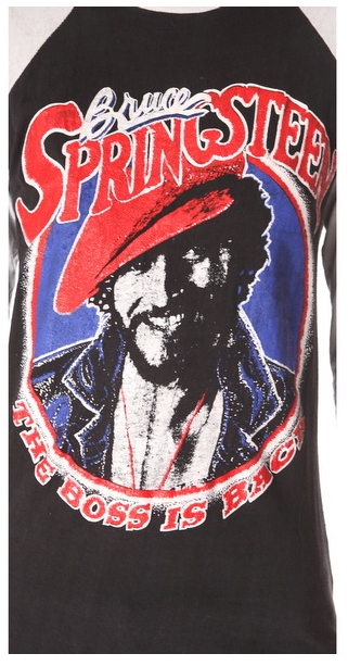 An authentic vintage Bruce Springsteen baseball tee with ‘THE BOSS IS BACK’ lettering on the front and ‘E-Street Band’ lettering on the back. Contrast 3/4 sleeves. Size: M.
