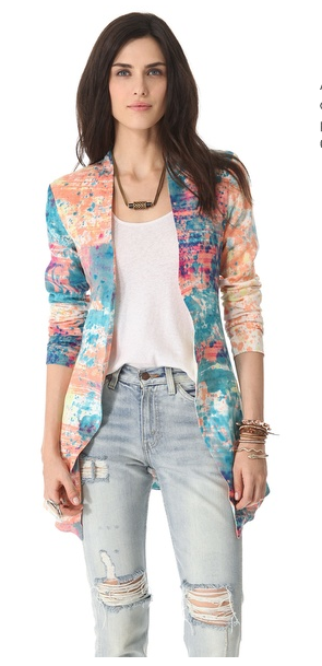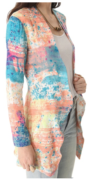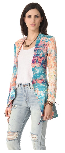 An oversized blazer from One Tea Spoon, rendered in color-splashed crepe for a playful edge. Vertical welt pockets detail the front, and a vent splits the back hem. Open placket and long sleeves. Lined.