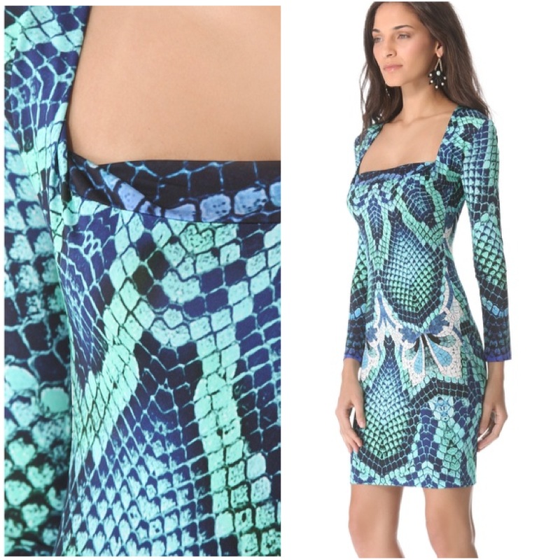 This slinky, curve-hugging Just Cavalli dress is cut with an angular neckline that frames the décolleté to alluring effect, while slim long sleeves temper the bold look. Unlined.