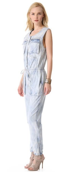 A faded, bleached-out wash lends a retro look to a lightweight denim jumpsuit from Rebecca Taylor. A mix of faux and real pockets punctuates the bodice, and a drawstring tie defines the silhouette. Exposed zip gussets accent the elastic cuffs. 4-pocket styling.