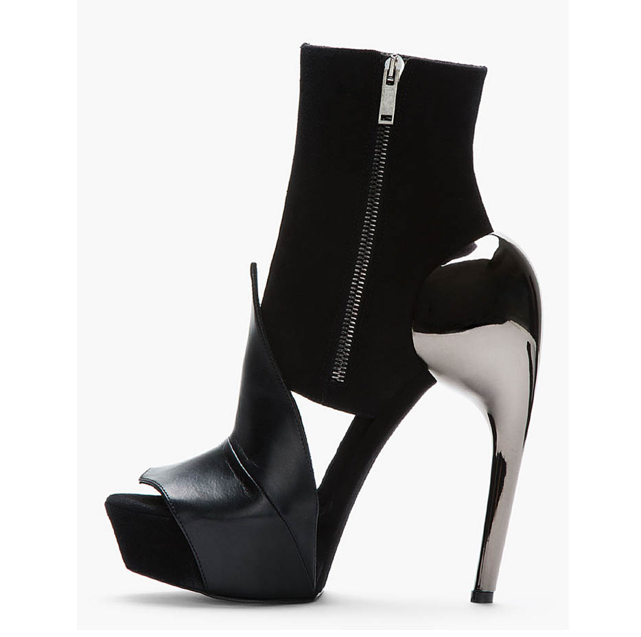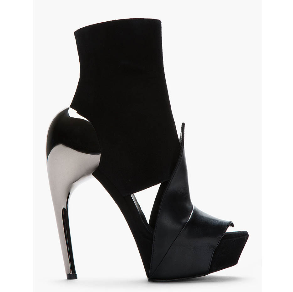 Classic form of accented heel boots gets a touch of Gareth Pugh’s signature sentiment, designed in elegant black suede. The pair is ankle-high designed in black with an almond open toe and tonal leather sole.