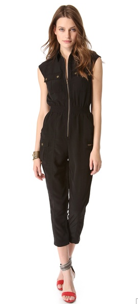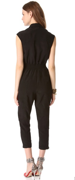 Brushed hardware and 6-pocket styling give this sateen jumpsuit a utilitarian look. Zips close the front and accent the cuffs, and smocked elastic cinches the waist.