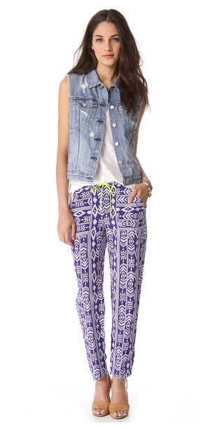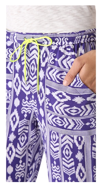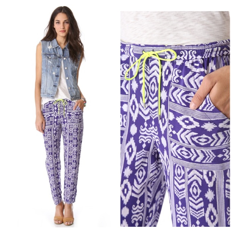 A beaded neon drawstring offers a bright contrast to the ikat-inspired pattern on these loose silk pants. The gathered elastic waistband offers a relaxed fit, and patch pockets lay at the hips.