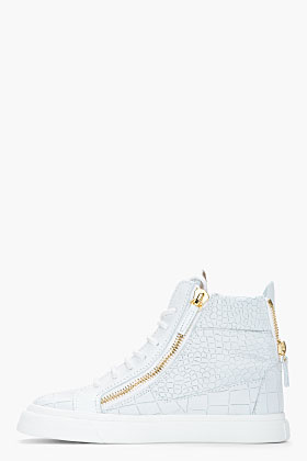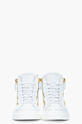 Mid-top sneakers in pale grey leather embossed with crocodile skin texture. White leather paneling throughout. Round toe. White lace-up closure. Tonal logo-stamped patch at padded bellows tongue. Exposed zip closures at either side of tongue gusset. Zip closure feature at heel collar. Padded collar. White rubber sole with textured foxing at toe and logo embossed at heel. Tonal stitching. Upper and lining: leather. Sole: rubber. Made in Italy.