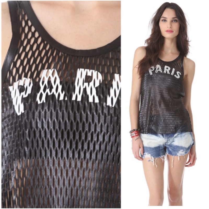 A scoop-neck tank in laser-cut leather offers an edgy take on a sporty staple. ‘PARIS’ lettering arches across the front, and a hint of fringe accents the hem. Semi-sheer.