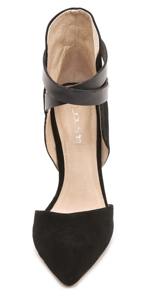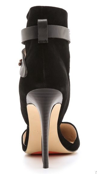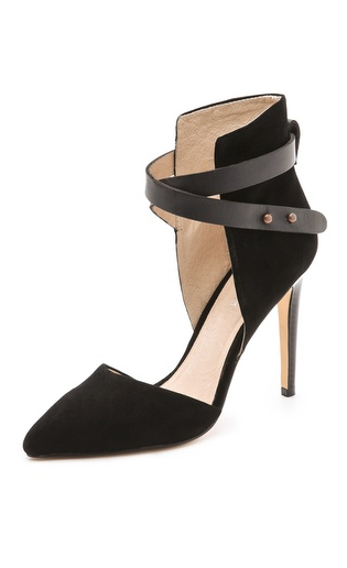 Statement-making suede pumps, styled with a modern twist. A smooth leather strap crisscrosses the ankle and buttons at the side. Stacked heel and rubber sole.