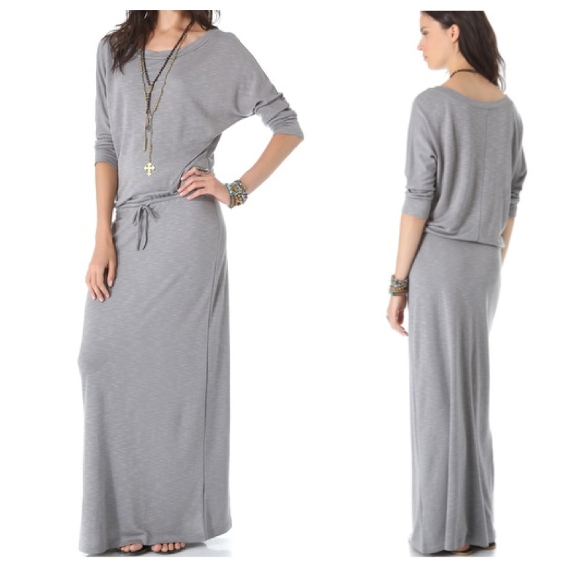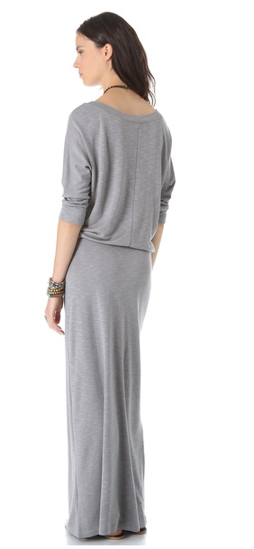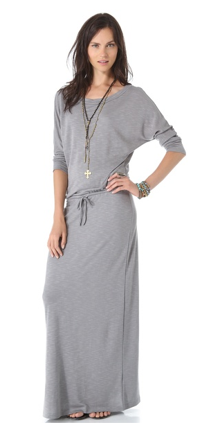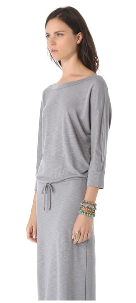 A draped french terry maxi dress is cinched with a drawstring waist. Elbow-length dolman sleeves. Unlined.