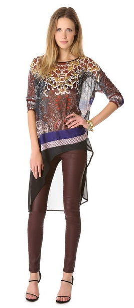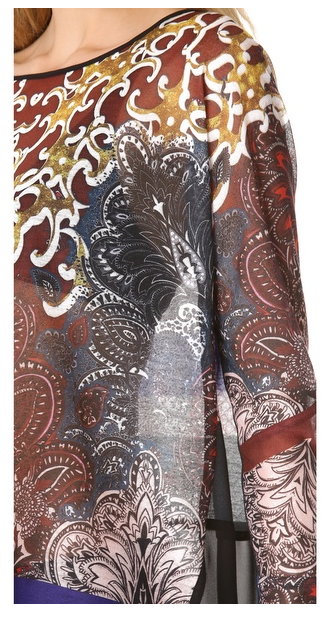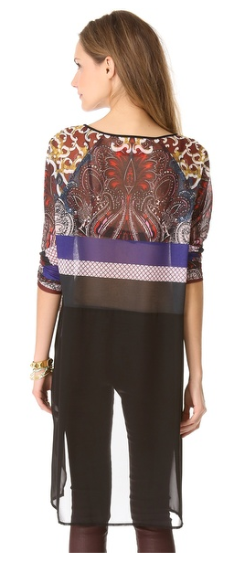 A bold paisley pattern blends bright and muted colors on a jersey Clover Canyon top. The asymmetrical hem is detailed with a flowing chiffon panel, adding a touch of drama. Long sleeves. Semi-sheer.