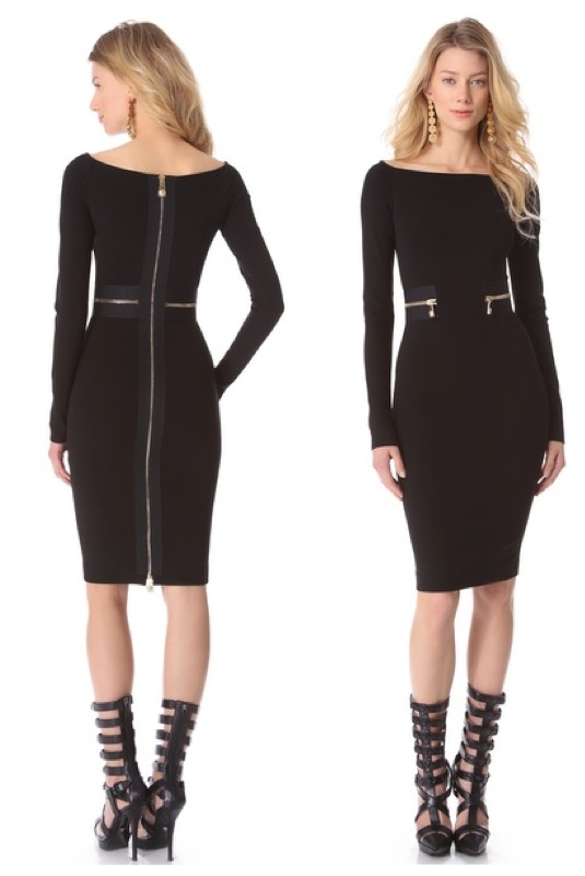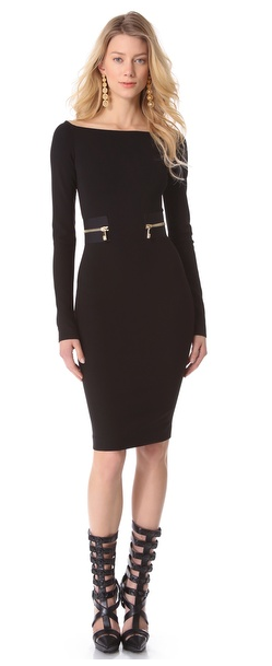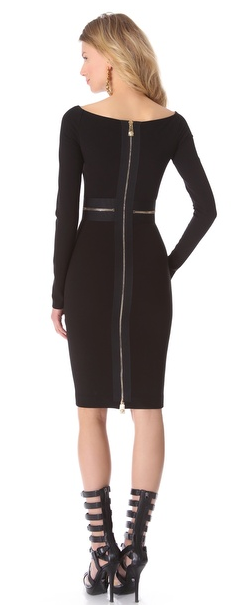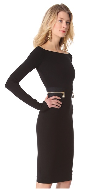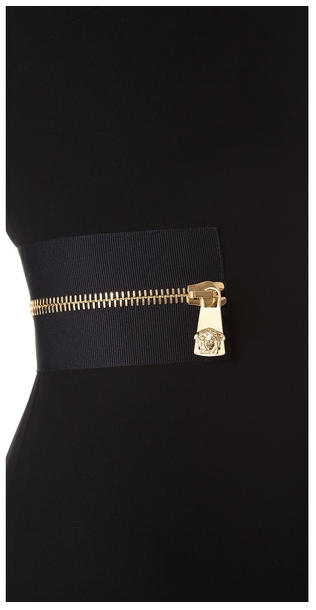 Zipped grosgrain bands define the silhouette of a slinky Versace sheath dress, hugging the waist to yield a sexy hourglass silhouette. The slim boat neck draws an elegant line across the collarbone, and grosgrain trim ensures a smooth fit along the extended, exposed back zip. Fitted long sleeves. Unlined.