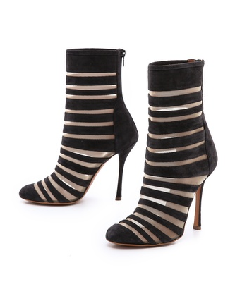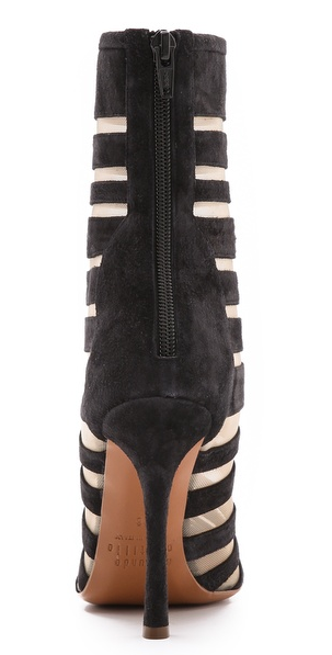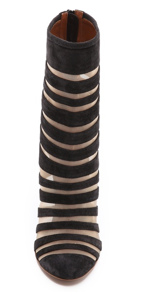 Velvety suede straps intersperse with nude mesh insets on these elegant, cage-inspired booties. Rounded cap toe and exposed back zip. Sculpted stiletto heel. Leather sole.