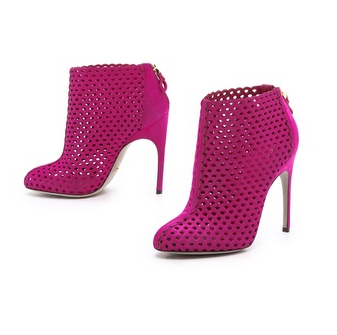 Tiny cutouts create an allover perforated texture on these brilliant suede Sergio Rossi booties. Scalloped edges and front seam. Exposed heel zip. Sculpted stiletto heel. Leather sole.