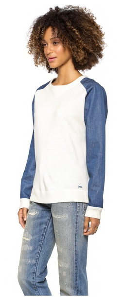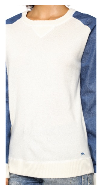 Contrast denim sleeves bring a classic, structured element to this soft cashmere sweater. Raglan styling and topstitched V inset. Ribbed edges. Semi-sheer.